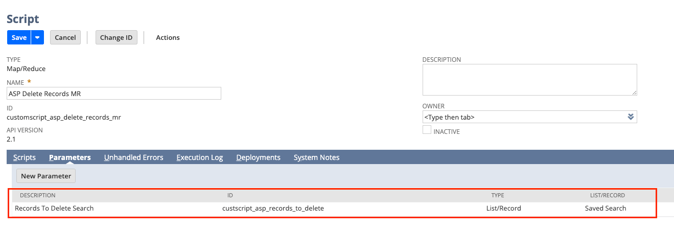 2. Include a parameter “Records to Delete Search” in the script record to allow dynamic input on which records to delete.